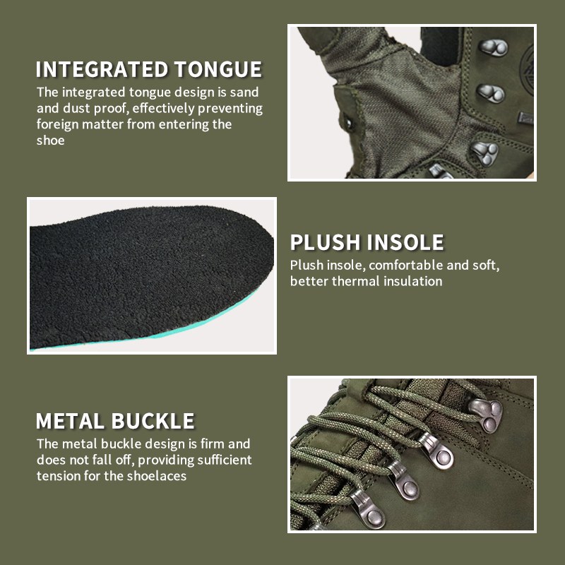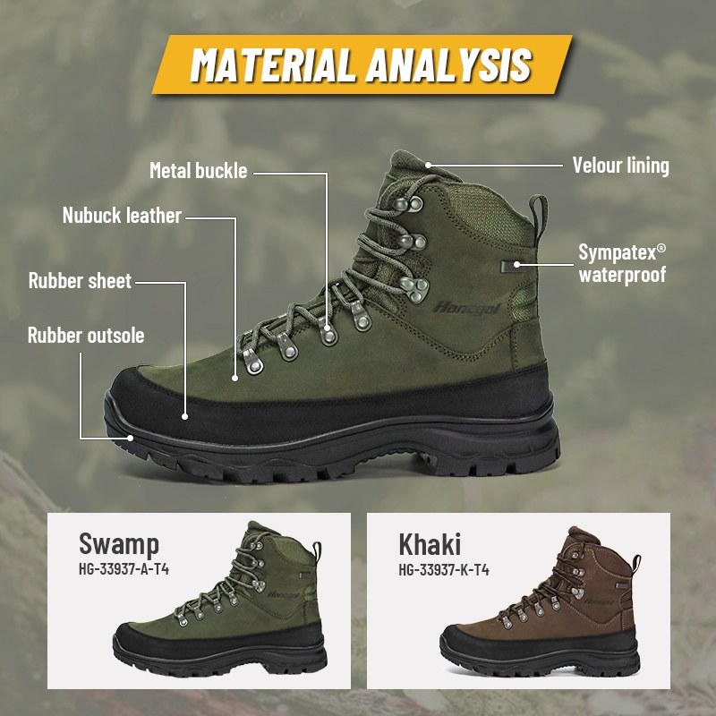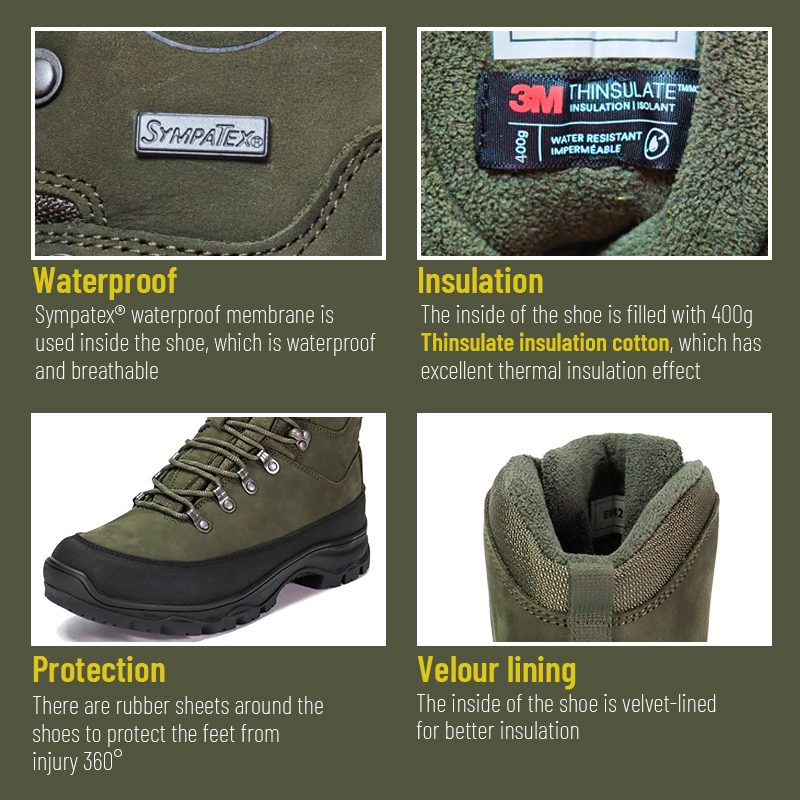 Kasut Memburu Thinsulate Penebat Kalis Air Sympatex ini tersedia untuk penyesuaian dalam warna, bahan dan butiran, dengan MOQ sebanyak 800 pasang, sesuai untuk kerjasama jenama dan perolehan kumpulan. Dan but memburu ini mempunyai kelebihan berikut: