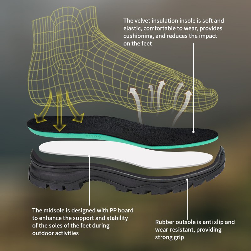 ①Lapik baldu. Lembut di bawah kaki. Menyerap kesannya. ②Tapak tengah PP untuk sokongan yang stabil. ③Tapak luar getah yang tidak boleh dilepaskan. Cengkaman, tahan lama, kekal boleh dipercayai.